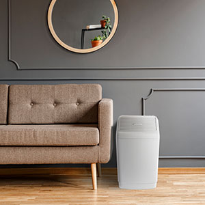 For smaller spaces - up to 1,000 square feet - the Companion series is a perfect...well, companion. This evaporative humidifier comes in bright white (shown) and matte black with stylish brushed chrome finish legs. Its digital controls are easy to use, and the water level indicator lets you know when it's time for a refill. While the Companion is a smaller unit, it holds nearly two gallons of water and runs up to 48 hours per fill.